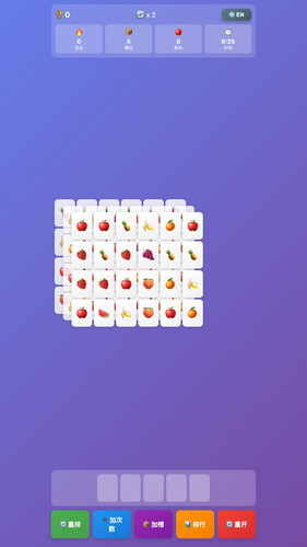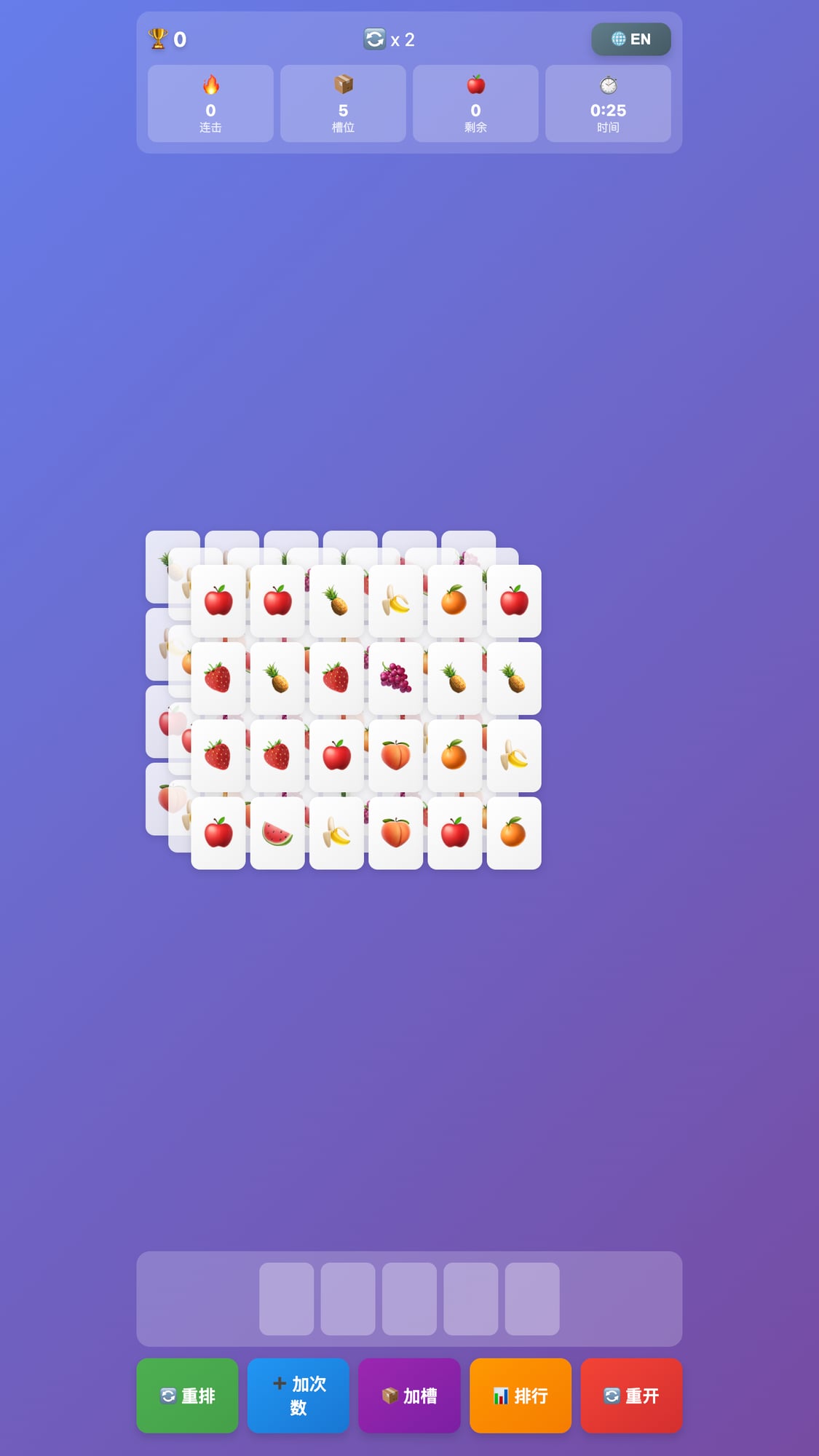 Match three identical fruits to clear them! Tap the top-layer fruits to collect them in your slots. Watch out — if all 5 slots fill up without a match, game over! If you want a easy game,support up to 7 slots,shuffles anytime when in trouble.
